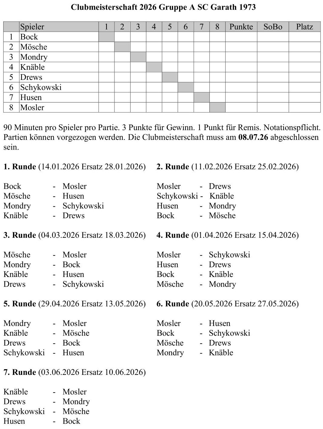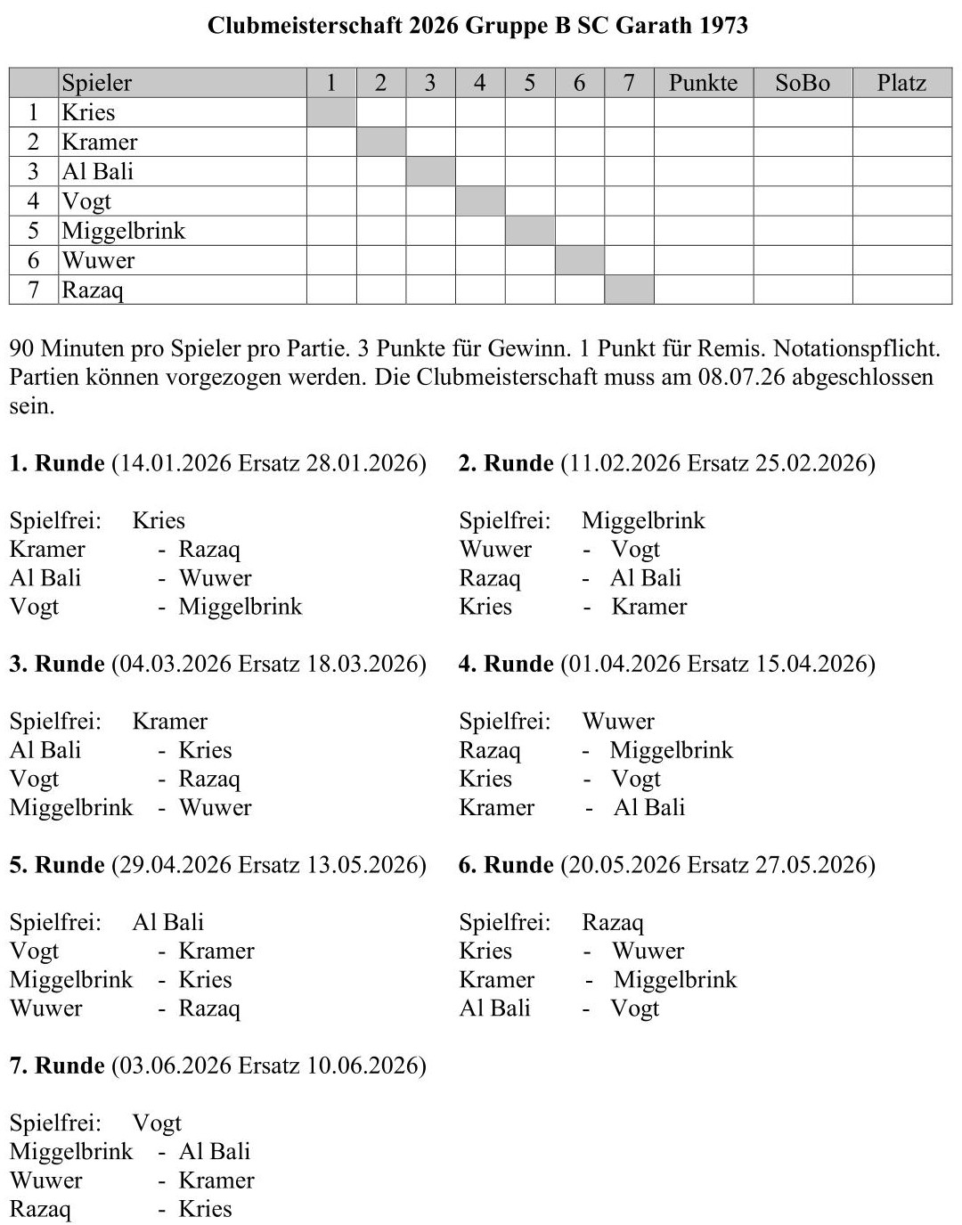 Das Spiel um den Clubmeister 2025 zwischen dem ersten der Gruppe A Nadjib Razaq und dem ersten der Gruppe B Wolfgang Kries endete remis. Im Blitz gewann Wolfgang Kries 2:1.